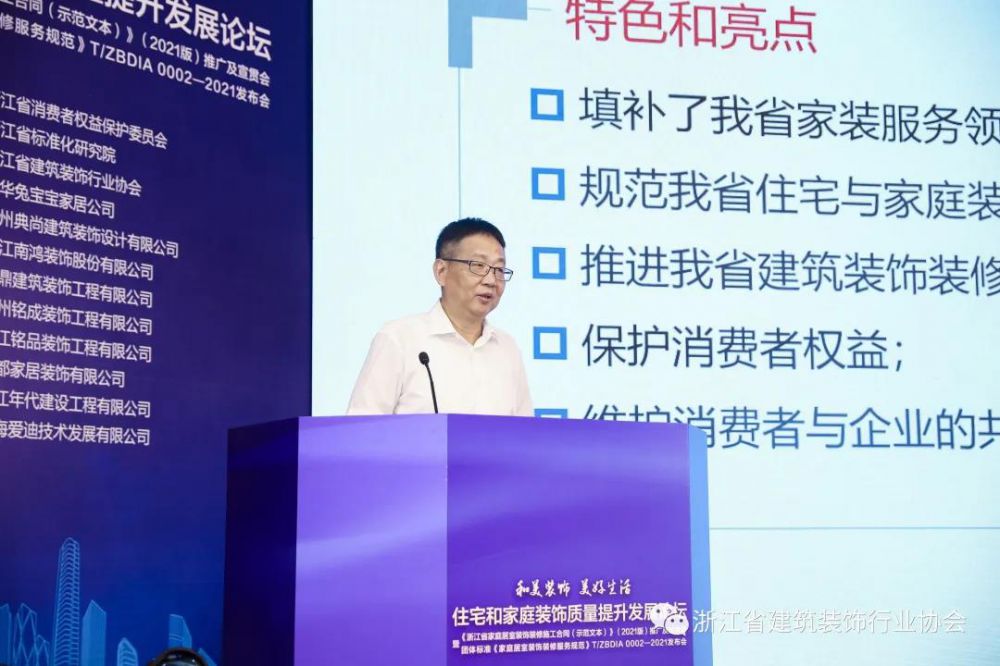 省標準化研究院院長陳自力在會上分享了《標準化引領(lǐng)家裝行業(yè)高質(zhì)量發(fā)展》專題演講,指出《家庭居室裝飾裝修服務(wù)規(guī)范》的出臺很及時、也很必要,具有特色和亮點,填補了我省家裝服務(wù)領(lǐng)域的標準空白;發(fā)布后,將與浙江省市場監(jiān)督管理局、浙江省消費者權(quán)益保護委員會、浙江省建筑裝飾行業(yè)協(xié)會共同發(fā)布的《浙江省家庭居室裝飾裝修施工合同示范文本》配套使用,共同給消費者構(gòu)筑透明、安全、健康的市場消費環(huán)境,對保護消費者權(quán)益、維護消費者與企業(yè)的共同利益具有重要意義。