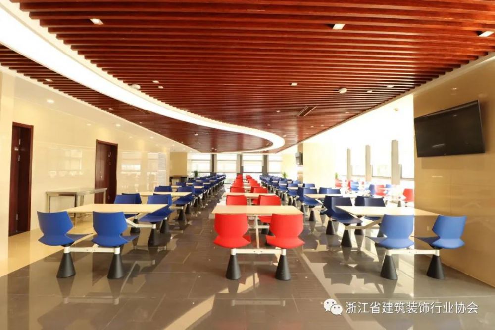 員工食堂,實(shí)木格柵吊頂,橫平豎直,風(fēng)口、燈具開(kāi)口規(guī)矩方正與頂棚結(jié)合緊密。外側(cè)采用全通透的玻璃,自然光輕松地灑落進(jìn)來(lái),讓整個(gè)空間視野變得更寬闊明亮。