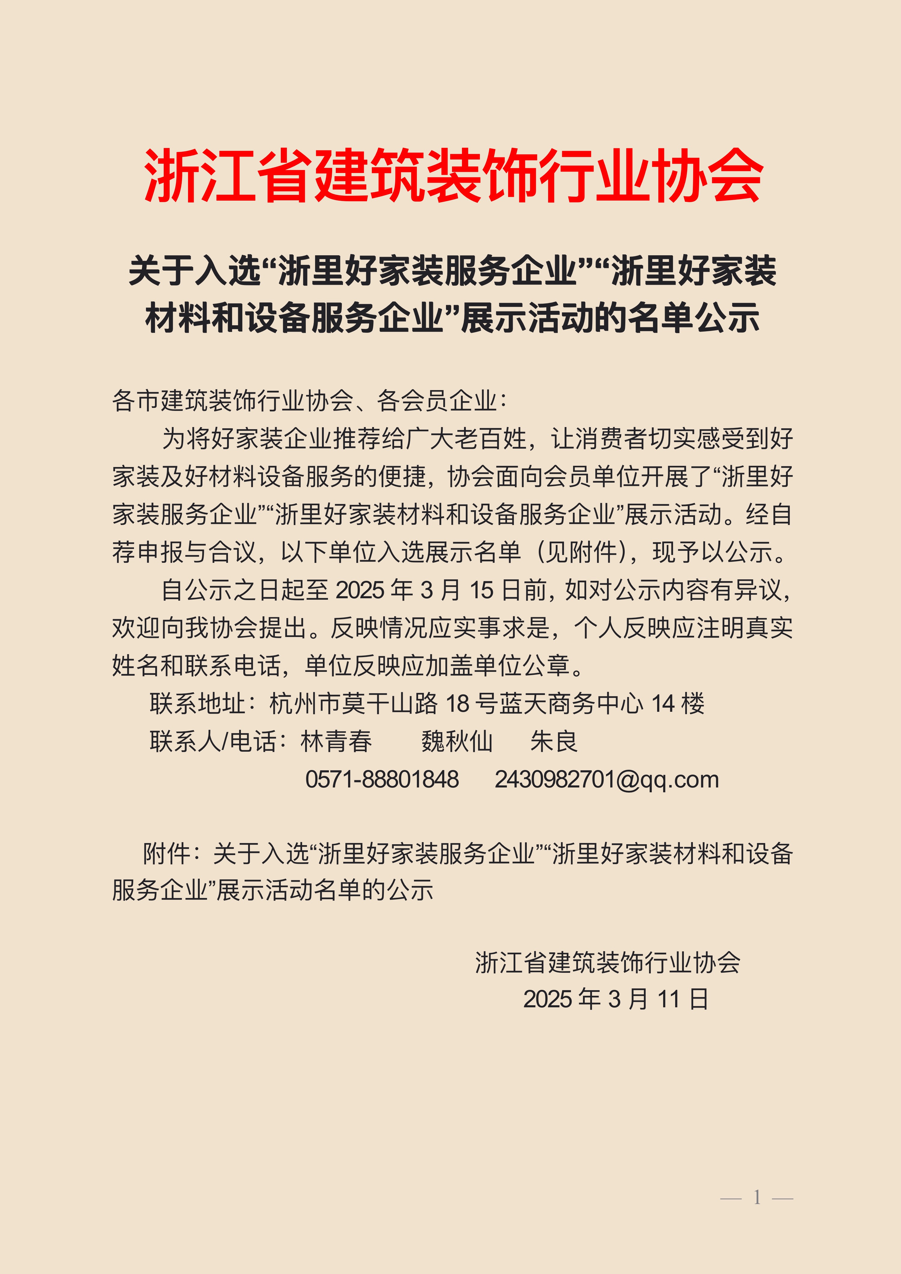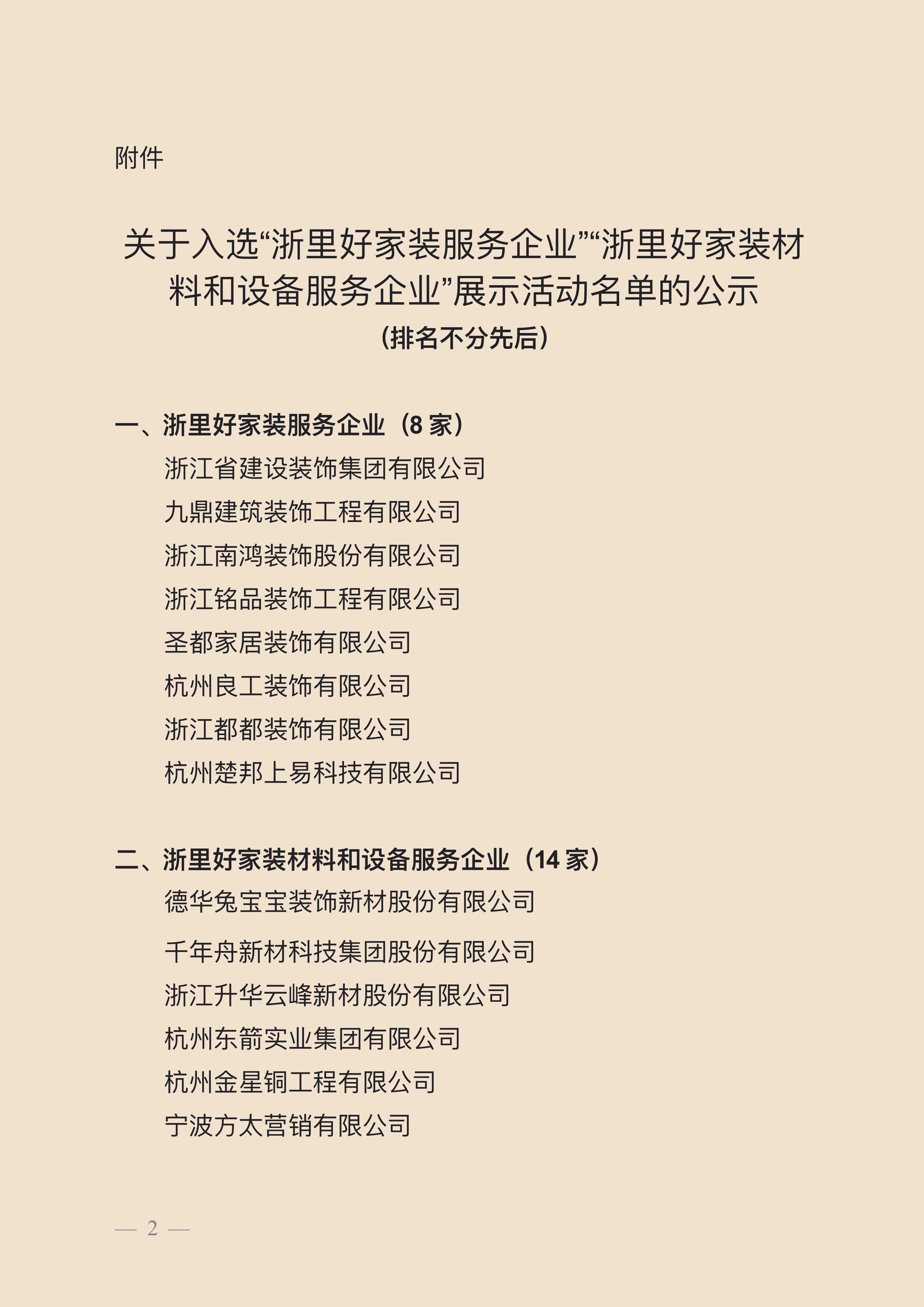 關(guān)于入選“浙里好家裝服務(wù)企業(yè)”“浙里好家裝材料和設(shè)備服務(wù)企業(yè)”展示活動(dòng)的名單公示